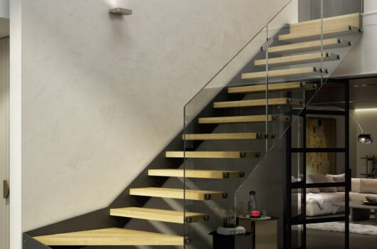 The models of railings for indoor stairs which can be installed on Lynar Soft are over 13, including glass panels fixed directly to the steps or on the side of the stringer.